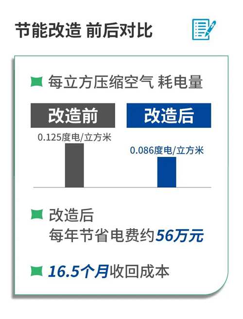 在改造成果方面,改造后客戶每立方壓縮空氣的耗電量減少了0.039度電。如果按每年開機(jī)時(shí)間為300天計(jì)算,改造后每年將為客戶節(jié)省電費(fèi)56萬(wàn)元。計(jì)算投資回報(bào)率,客戶16.5個(gè)月即可收回購(gòu)機(jī)成本,節(jié)能改造的效果顯著。