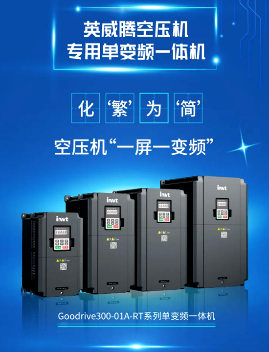 近日,英威騰重磅推出一款針對空壓機行業(yè)全新開發(fā)的一款單變頻一體機——GD300-01A-RT系列變頻器。