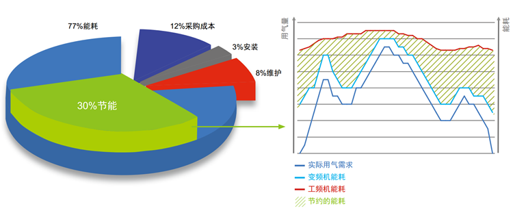---以5年的時(shí)間為例,壓縮機(jī)的能耗成本占總運(yùn)行成本約70%,這正是將節(jié)能的主要關(guān)注點(diǎn)放在降低壓縮機(jī)本身能耗成本上的主要原因。