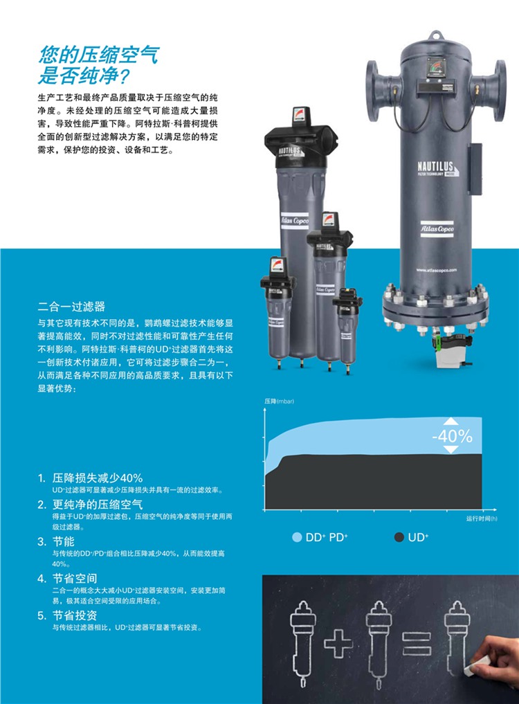 阿特拉斯UD+組合式過濾器二合一鸚鵡螺過濾器技術(shù)可使能源開支減少40%,獲得一流的空氣純度,為您的投資、設備和流程提供保護。